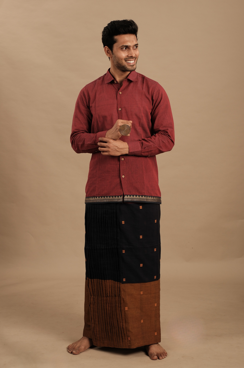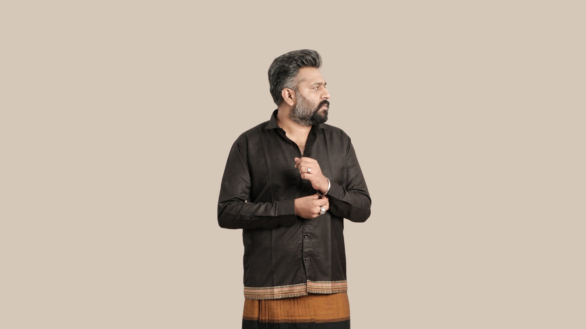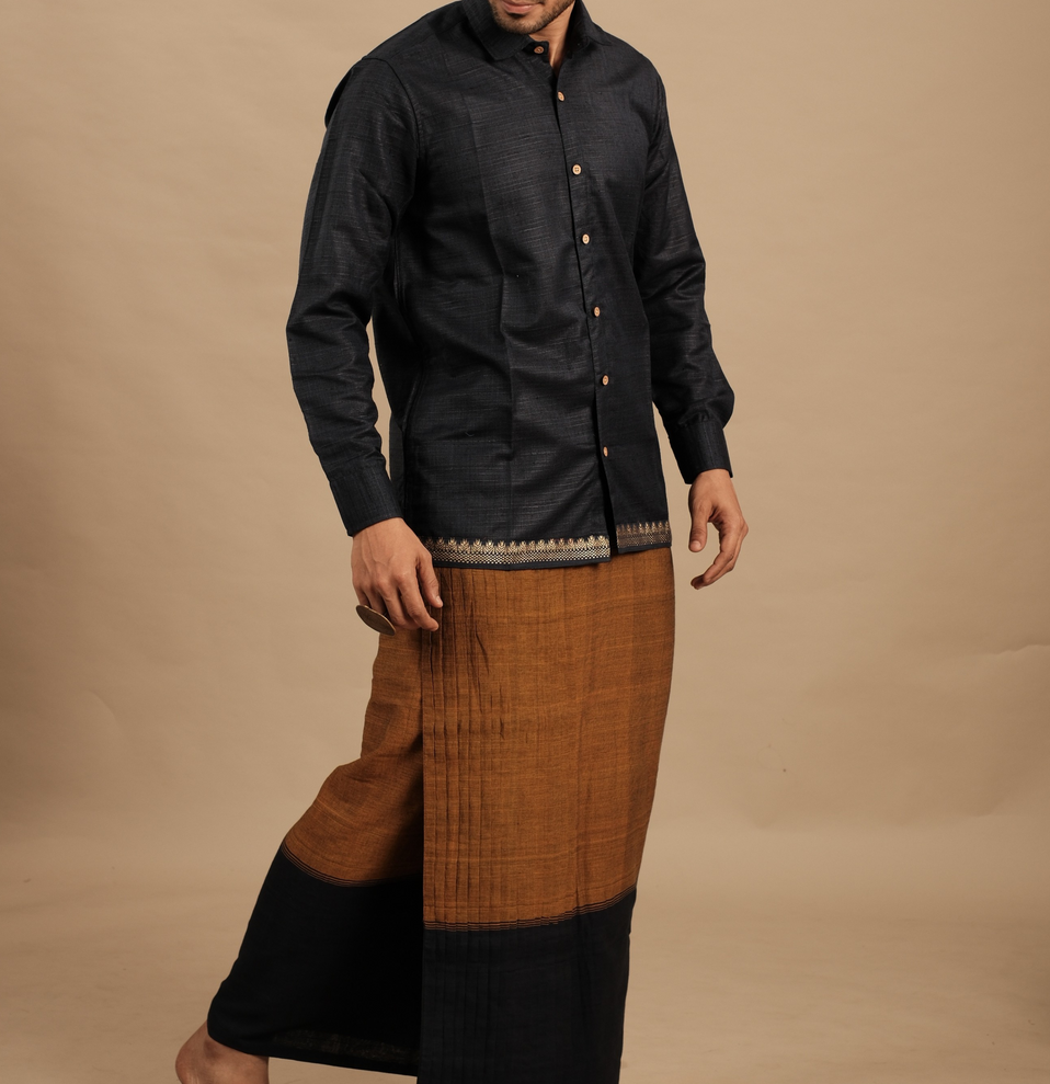 Crafted from handwoven silk, the Ambari shirt defines understated elegance. Its texture carries a matte sheen, creating a look that’s both royal and contemporary. Designed to complement the richness of the pattu veshti, this shirt bridges modern tailoring with classic South Indian grace — bold, confident, and unmistakably refined.